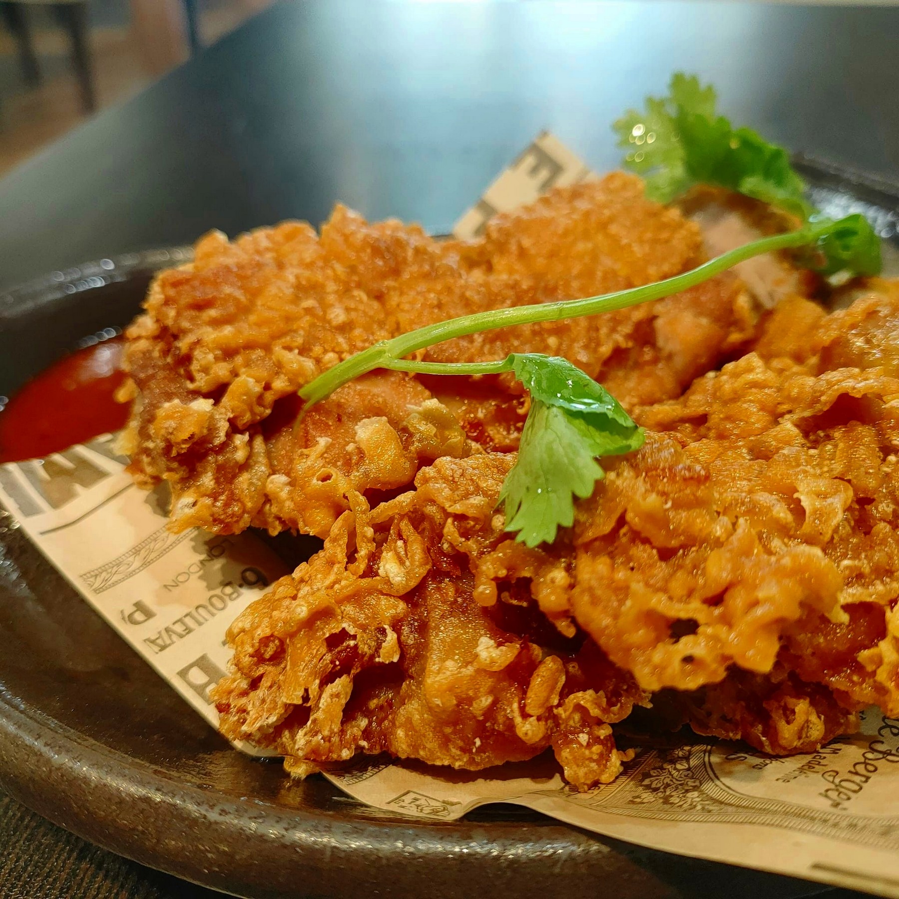 外表炸得酥脆,內裡軟嫩多汁。搭配的紅色泰式辣醬,對我味道略重,個人覺得搭配店裡的青木瓜醬(泰式甜辣醬),味道更是一絕.
