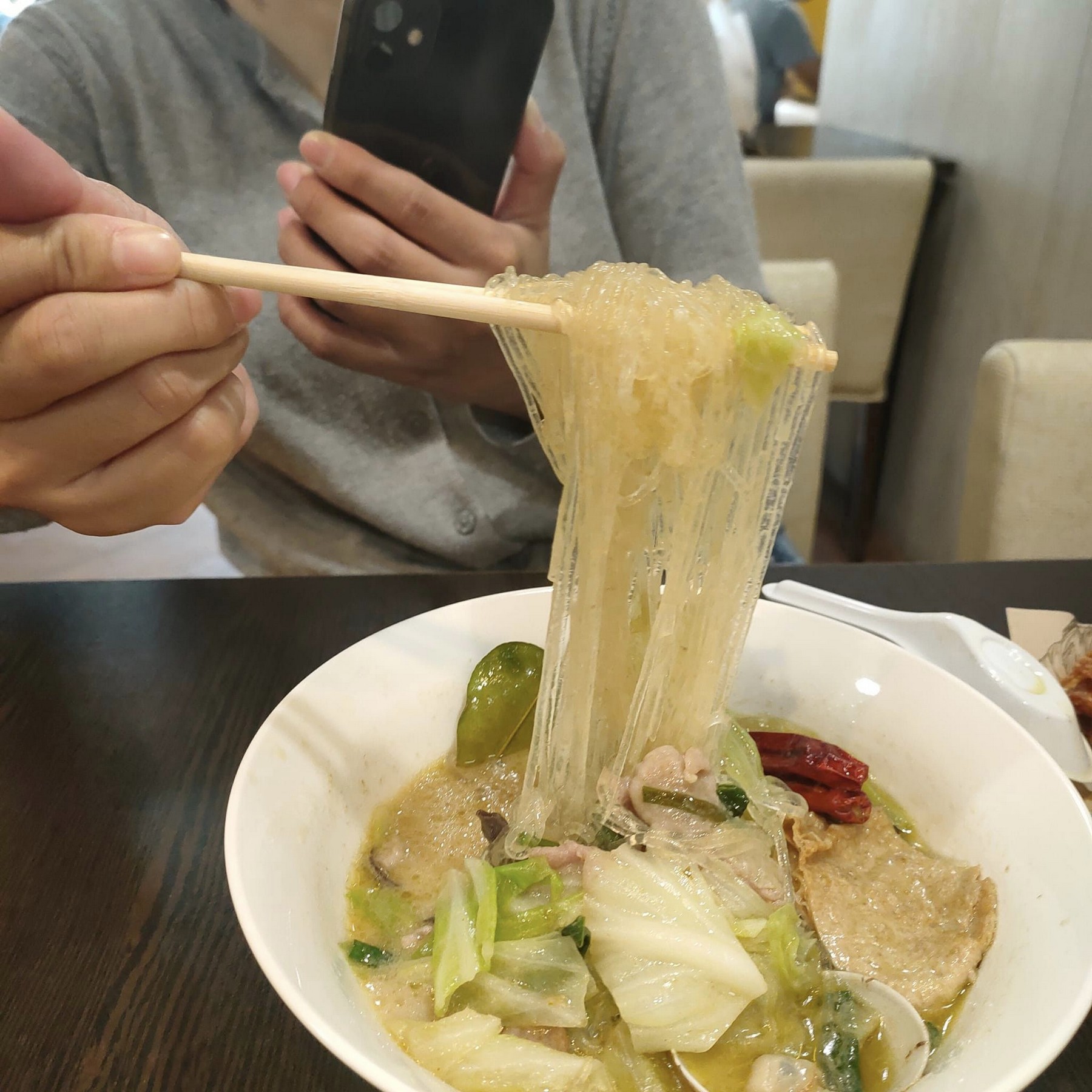 綠咖哩、月桂葉及椰汁的香氣撲鼻而來,冬粉吸滿湯頭的鮮美,讓我們這種食客除了滿足咀嚼的愉悅,更讓湯頭帶來的鮮美滿足嘴裡的味蕾。