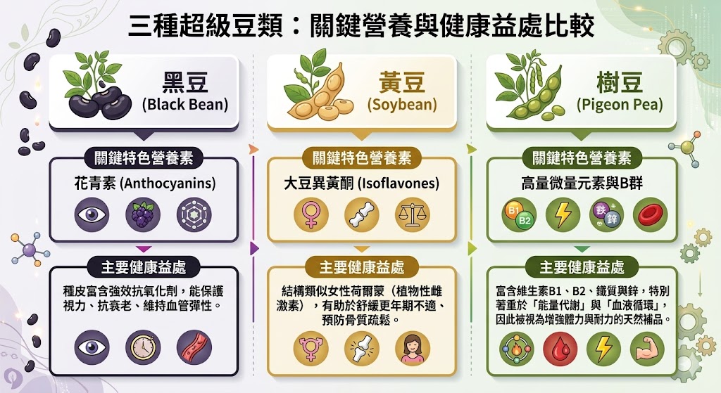 樹豆、黃豆和黑豆雖然都是營養價值極高的豆類,但它們在營養學上的分類和主要成分有著根本的差異。